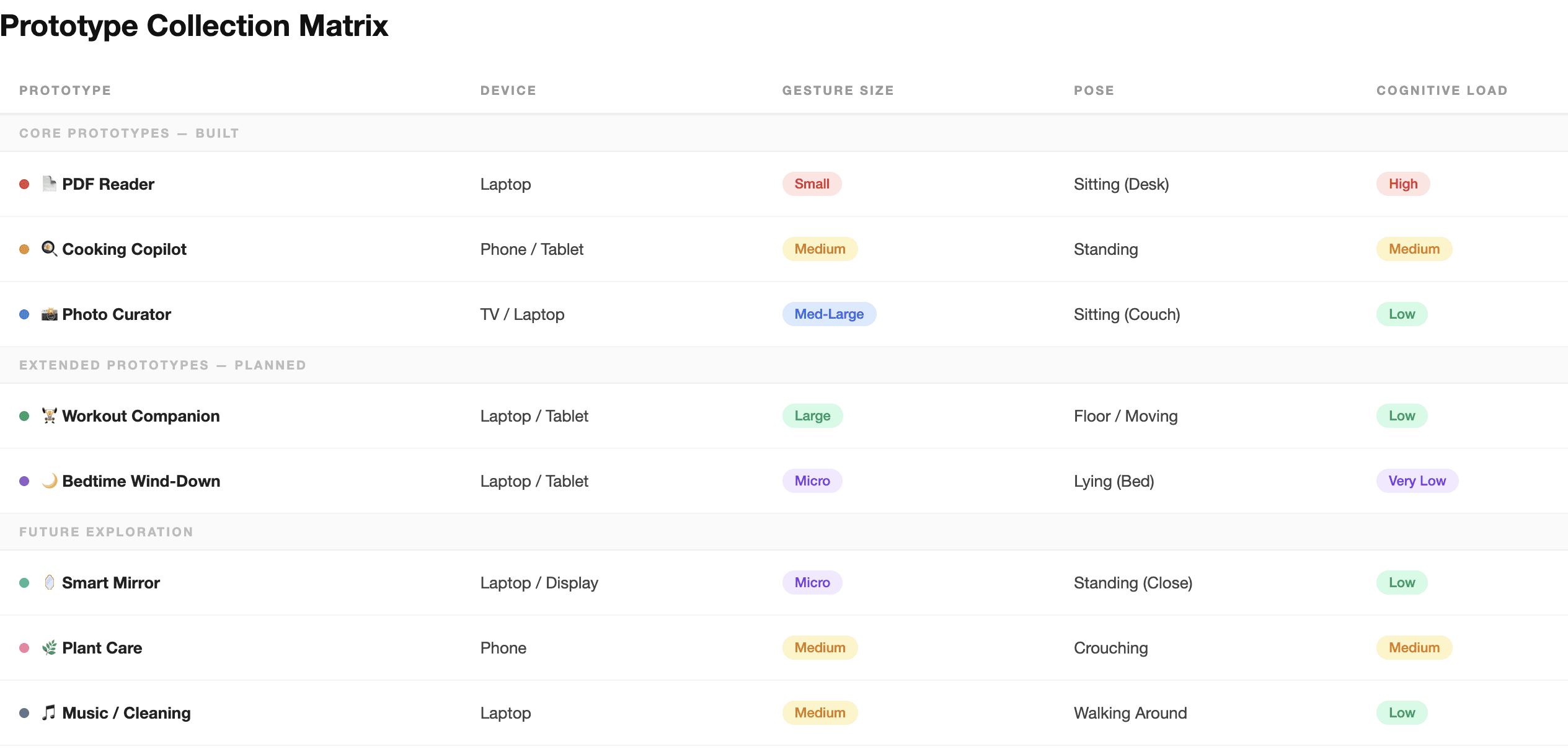 Instead of one prototype, I designed a strategic collection where each prototype bridges a specific adoption barrier using accessible Phase 1 technology, just a webcam or phone camera. Each targets a different device, cognitive load level, and daily context, forming stepping stones from screen-bound interaction toward spatial computing. The collection demonstrates that transition design should start in leisure/home environments, where people are most open to new interaction patterns, the strategic doorway to broader adoption.